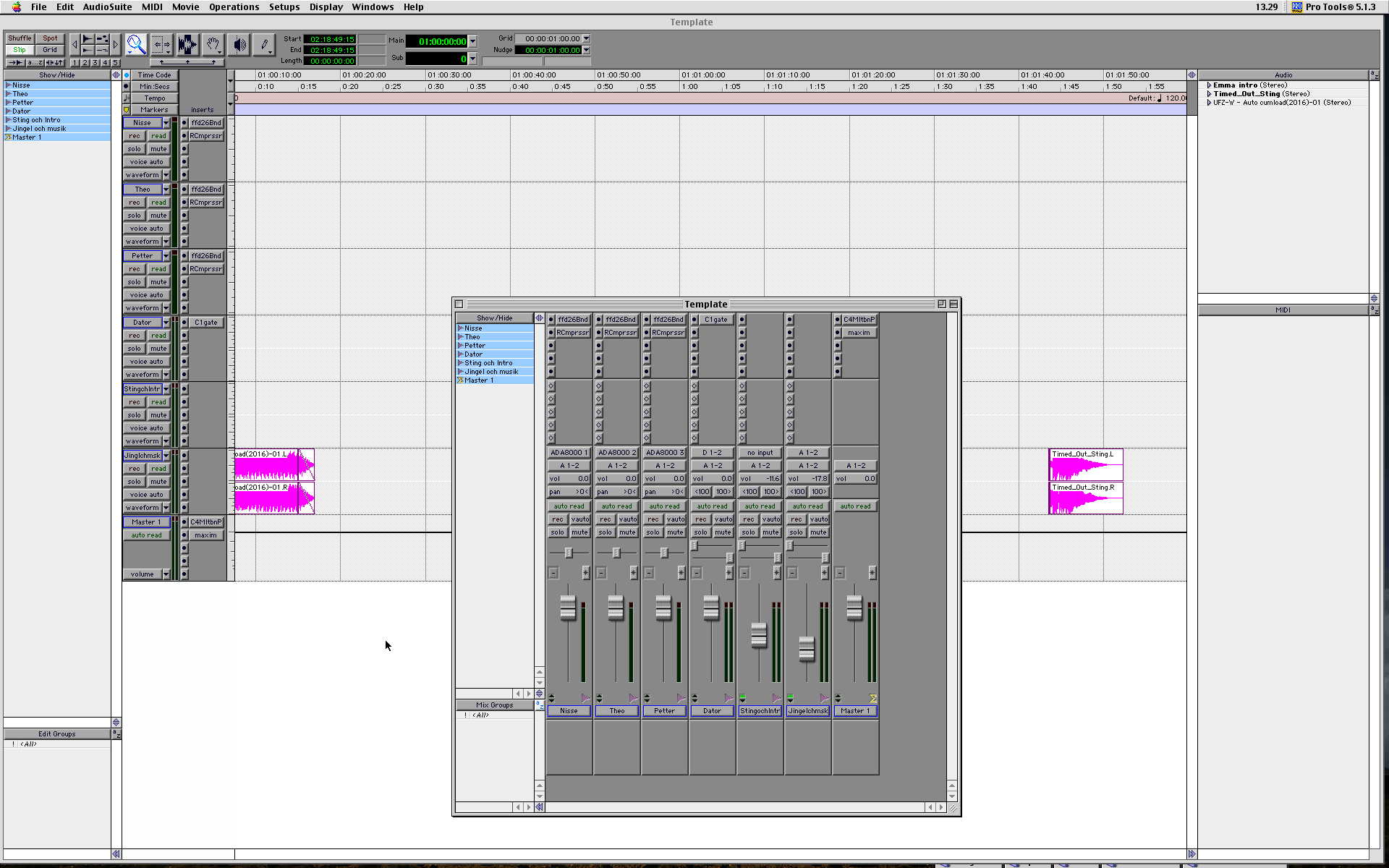 So I have prepared a template that I base my work around. I want the sound to be consistent over many episodes, so I don't want to create a new project and add the tracks, the plugins etc. every time we make a new episode.Pro Tools 5.1.3 doesn't support templates out of the box. So I've made a project that serves as a project template for an episode. I copy (option + drag) the folder of this template project to create a working copy for the current episode we're about to record and name the project according to the car we're basing the episode around.
